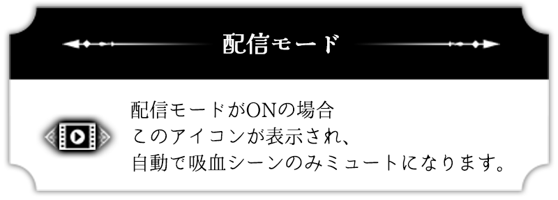 「配信モード」を「ON」にすると自動で吸血シーンのみミュートになります。(手動でミュートでも可能です。)